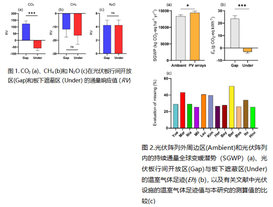 近日,基于在我国东北松嫩草地开展的野外原位研究,生命科学学院邢福教授团队发现,光伏阵列的行间开放区域(Gap)是CO2的“源”,而光伏板下的遮蔽区域(Under)则是CO2的“汇”;同时,行间区域和遮蔽区域均是CH4的“汇”和N2O的“源”(图1)。与光伏阵列外的周边草地(Ambient)相比,光伏阵列内的持续通量全球变暖潜势(SGWP)增加8.14 %(图2)。结构方程模型(SEM)分析表明,光伏阵列对依托的草地温室气体通量的影...