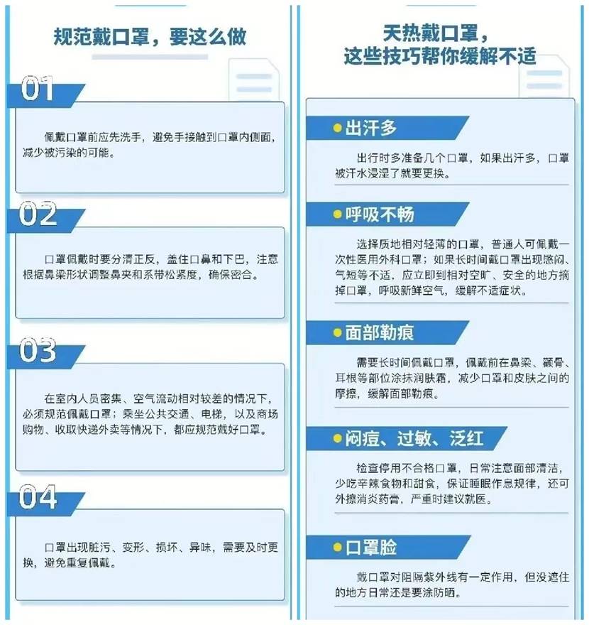 炎炎夏季,气温正逐渐升高,戴口罩的闷热感也越来越明显,但是在疫情防控期间,个人防护丝毫不能放松。让我们一起看看这些能缓解不适的温馨提示吧!大家要时刻保持警惕,坚持正确佩戴口罩。战“疫”路上,坚持就是胜利,千万不能掉以轻心