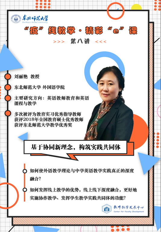 为帮助教师更好地开展线上教学活动,创新教学模式,服务教师教学发展,提升线上教学质量,发挥区域辐射与引领作用,教师教育研究院教师教学发展中心推出“‘疫’线教学·精彩‘e’课”系列活动。本期带来第八讲——基于协同新理念,构筑实践共同体。本次活动主讲人为外国语学院教师刘丽艳。基于协同新理念,构筑实践共同体为促进外语教学理论与中学英语教学实践的深度融合,主讲教师吸引优秀中学英语教师与大学教师组成授课团队...