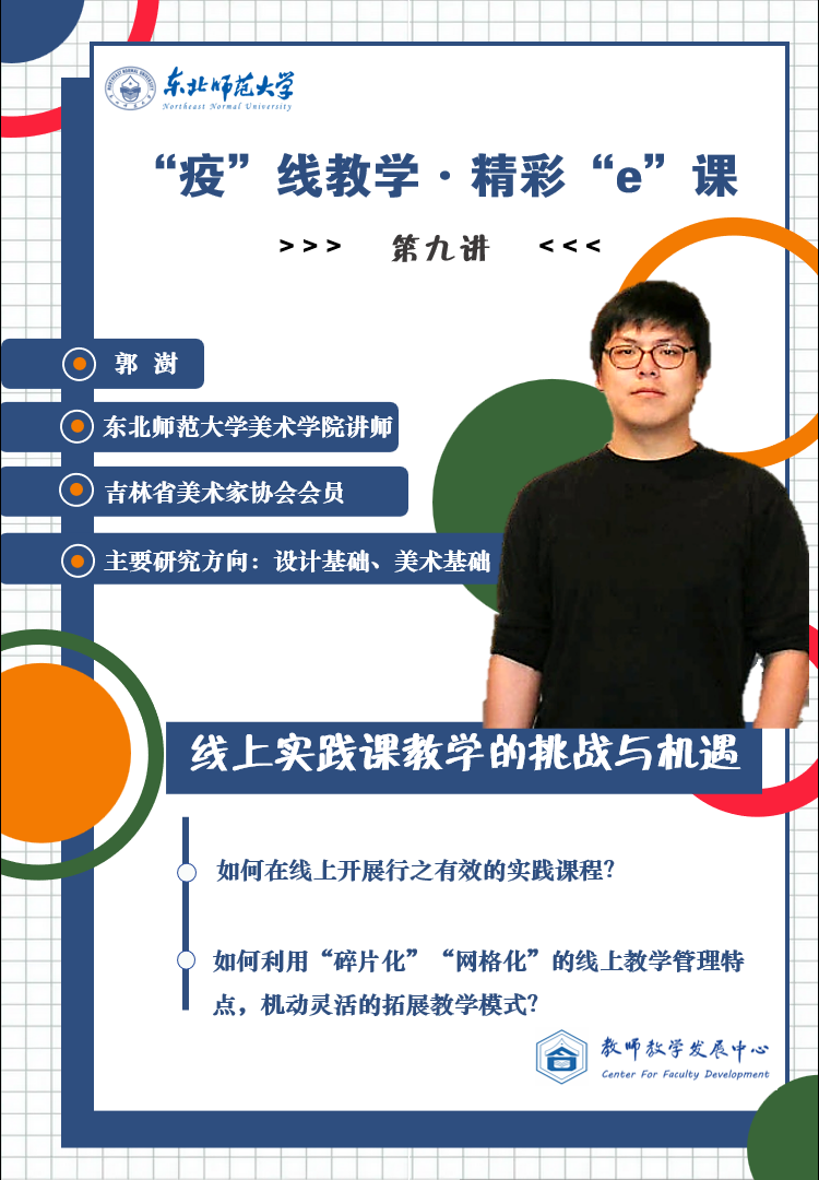 为帮助教师更好地开展线上教学活动,创新教学模式,服务教师教学发展,提升线上教学质量,发挥区域辐射与引领作用,教师教育研究院教师教学发展中心推出“‘疫’线教学·精彩‘e’课”系列活动。本期带来第九讲——线上实践课教学的挑战与机遇。本次活动的主讲人为美术学院教师郭澍。线上实践课教学的挑战与机遇《形式语言2-空间》是一门设计学类专业基础实践课程,本课程的重点是空间构成要素特性、空间构成形式规律与材料感知...