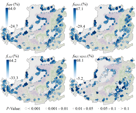 图3 基于四种遥感数据(NPP、NDVI、LAI和PKU NDVI)得到的植被恢复工程对植被变绿贡献的空间分布