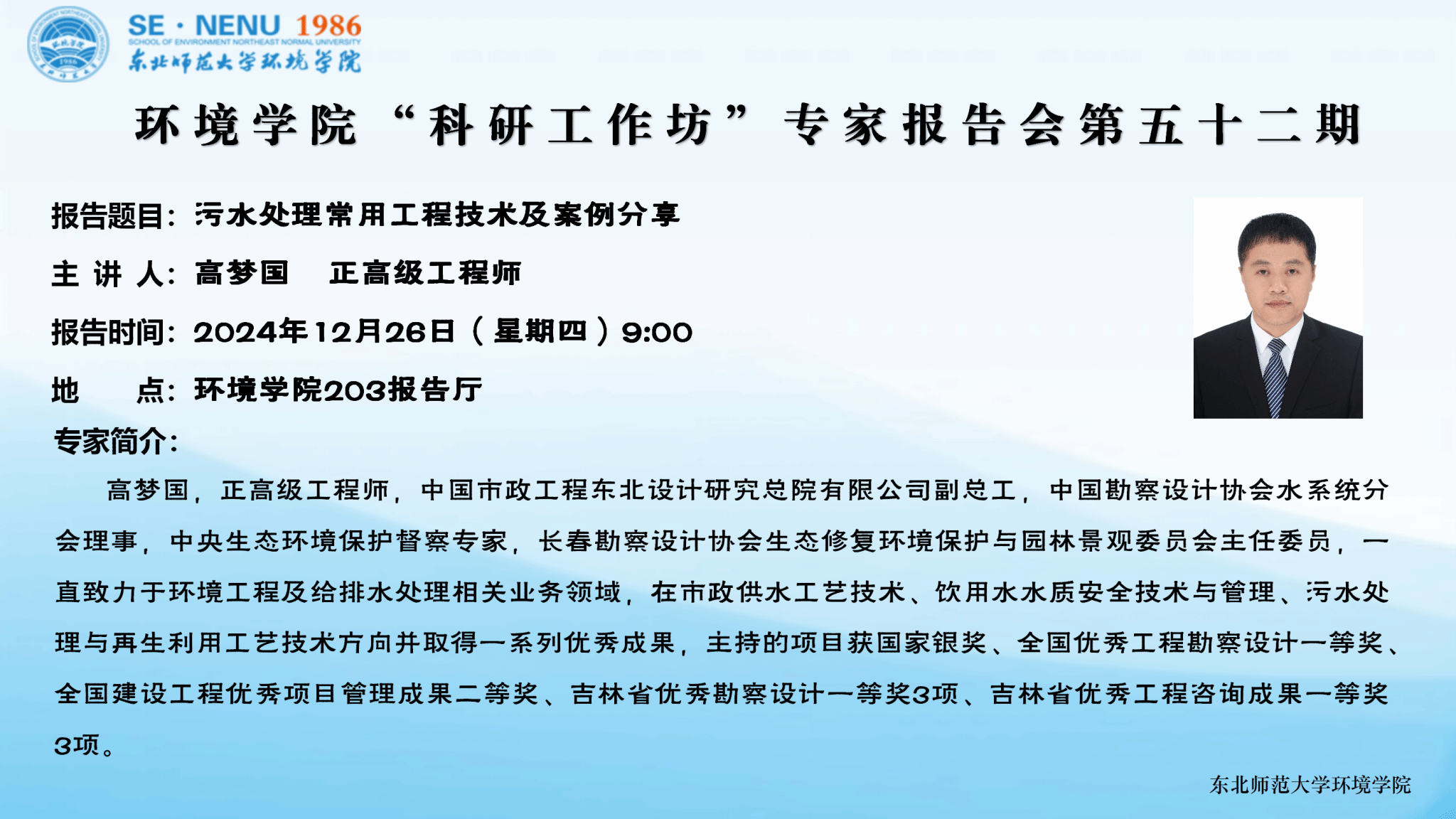 高梦国,正高级工程师,中国市政工程东北设计研究总院有限公司副总工,中国勘察设计协会水系统分会理事,中央生态环境保护督察专家,长春勘察设计协会生态修复环境保护与园林景观委员会主任委员,一直致力于环境工程及给排水处理相关业务领域,在市政供水工艺技术、饮用水水质安全技术与管理、污水处理与再生利用工艺技术方向取得一系列优秀成果,主持的项目获国家银奖、全国优秀工程勘察设计一等奖、全国建设工程优秀项目管理成果二等奖、吉林省优秀勘察设计一等奖3项、吉林省优秀工程咨询成果一等奖3项。