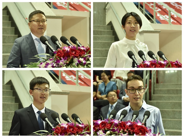 典礼上,教师代表、化学学院院长朱广山教授,在校生代表、生命科学学院2017级博士研究生周容光,新生代表、经济与管理学院2019级本科生白东平,国际学生代表、心理学院2019级硕士研究生阿德里安也分别作了发言。