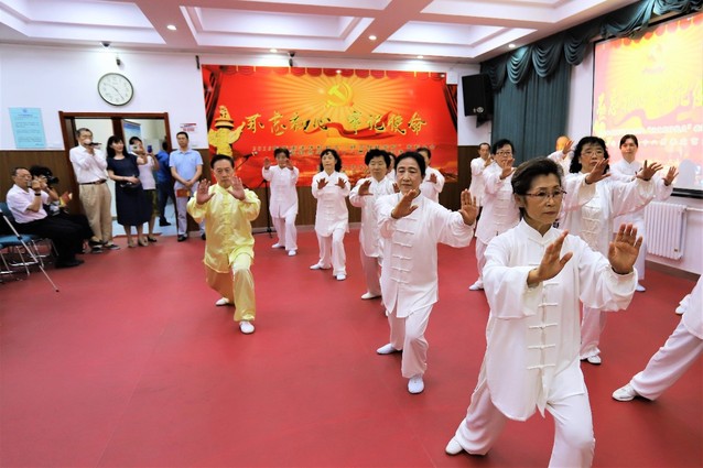 表彰大会结束后,由离退休教职工自编自导自演的文艺演出正式开始,老同志们载歌载舞,共同庆祝党的九十八岁生日。