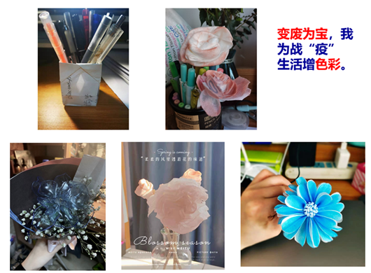 5.针对疫情防控期间学生活动范围有限的实际情况,教师布置“废物利用,变废为宝”课后环保手工制作活动。一方面让学生用精美的手工,给战“疫”生活带来一抹亮色;另一方面鼓励学生身体力行,亲自动手实践,践行绿色低碳的生活方式,养成环保节约的行为习惯。