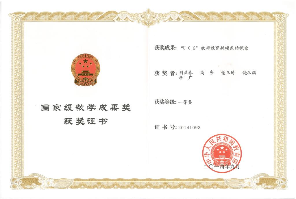 “U-G-S教师教育新模式的探索”获高等教育国家级教学成果一等奖。2014年,我校申报的“U-G-S教师教育新模式的探索”获高等教育国家级教学成果一等奖,相关经验在全国推广。该模式由为破解师范生实习难、基础教育学校教师培训难、大学学科教育教师发展难的“三难问题”,升级为要实现“三高”,即师范生获得高质量实习、基础教育教师接受高质量培训、学科教育教师实现高质量发展。