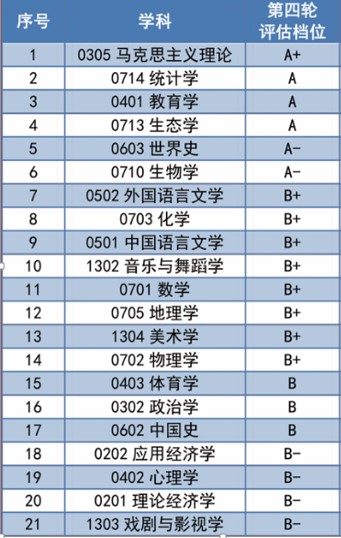 在教育部第四轮学科评估中,6个学科进入A类。2017年12月,教育部学位与研究生教育发展中心公布全国第四轮学科评估结果。我校6个学科获评A类学科,位列全国高校第33位,其中马克思主义理论获评A+档,教育学、生态学、统计学获评A档,世界史、生物学获评A-档。另有15个学科进入B类,共计21个学科进入同类参评学科的前40%,占学校参评学科总数的81%,为我校扎根中国大地,建设世界一流师范大学奠定了坚实的学科基础。
