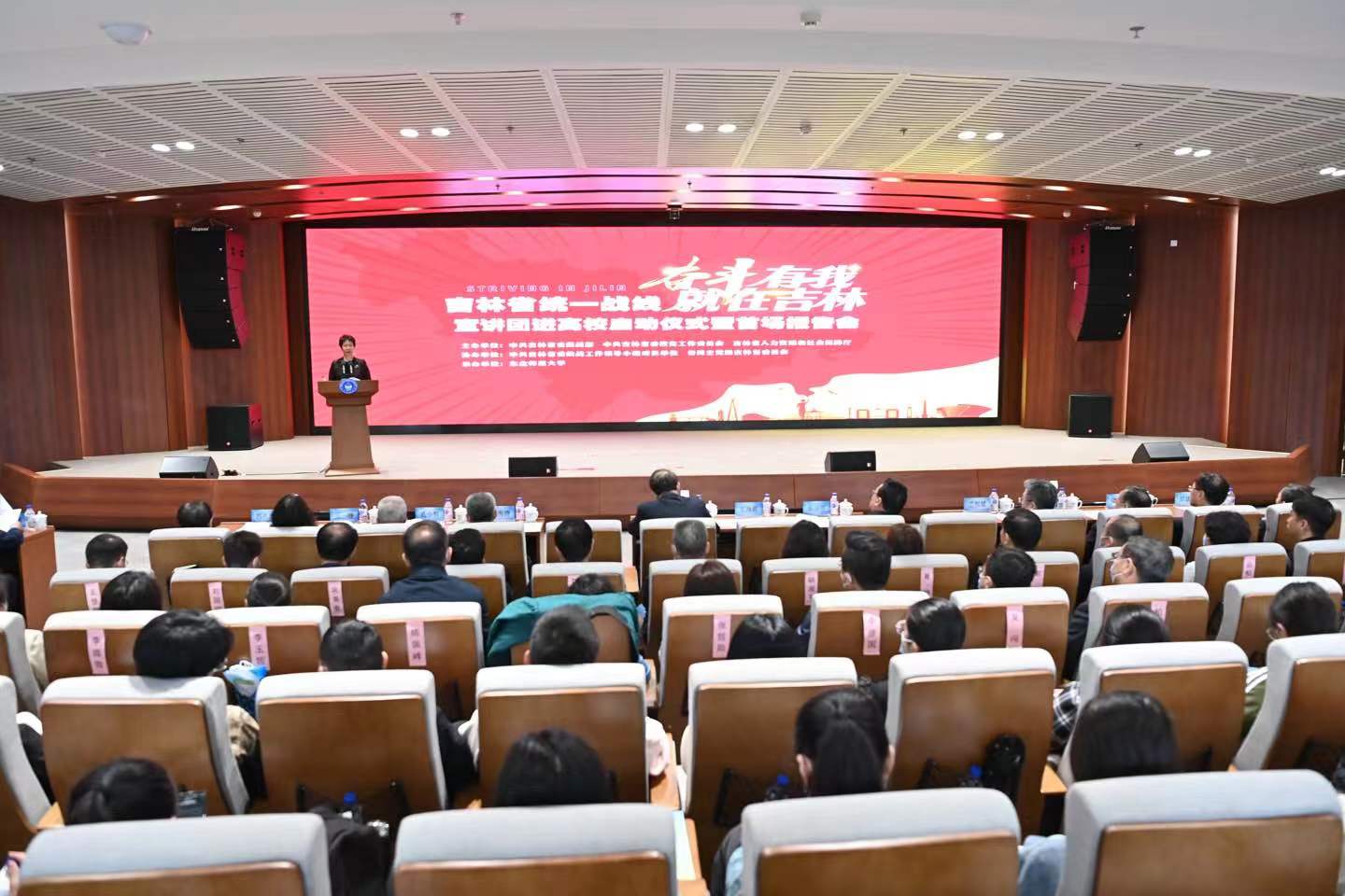 5月12日,由吉林省委统战部、吉林省委教育工委、吉林省人社厅主办的全省统一战线“奋斗有我,就在吉林”宣讲团进高校启动仪式暨首场报告会在我校举办。省委常委、统战部部长吴海英,省主题教育第二巡回指导组组长彭永林,省政协副主席、民进省委会主委蔡国伟,省政协副主席、农工党省委会主委秦海涛出席,中直、省直部门单位负责人,各民主党派省委会负责人,在长高校分管统战工作领导和统战部部长,我校党委书记兰恒斌,党委副书记王延,副校长魏民,党委常委、统战部部长艾春明,以及300余名师生代表参加了会议。