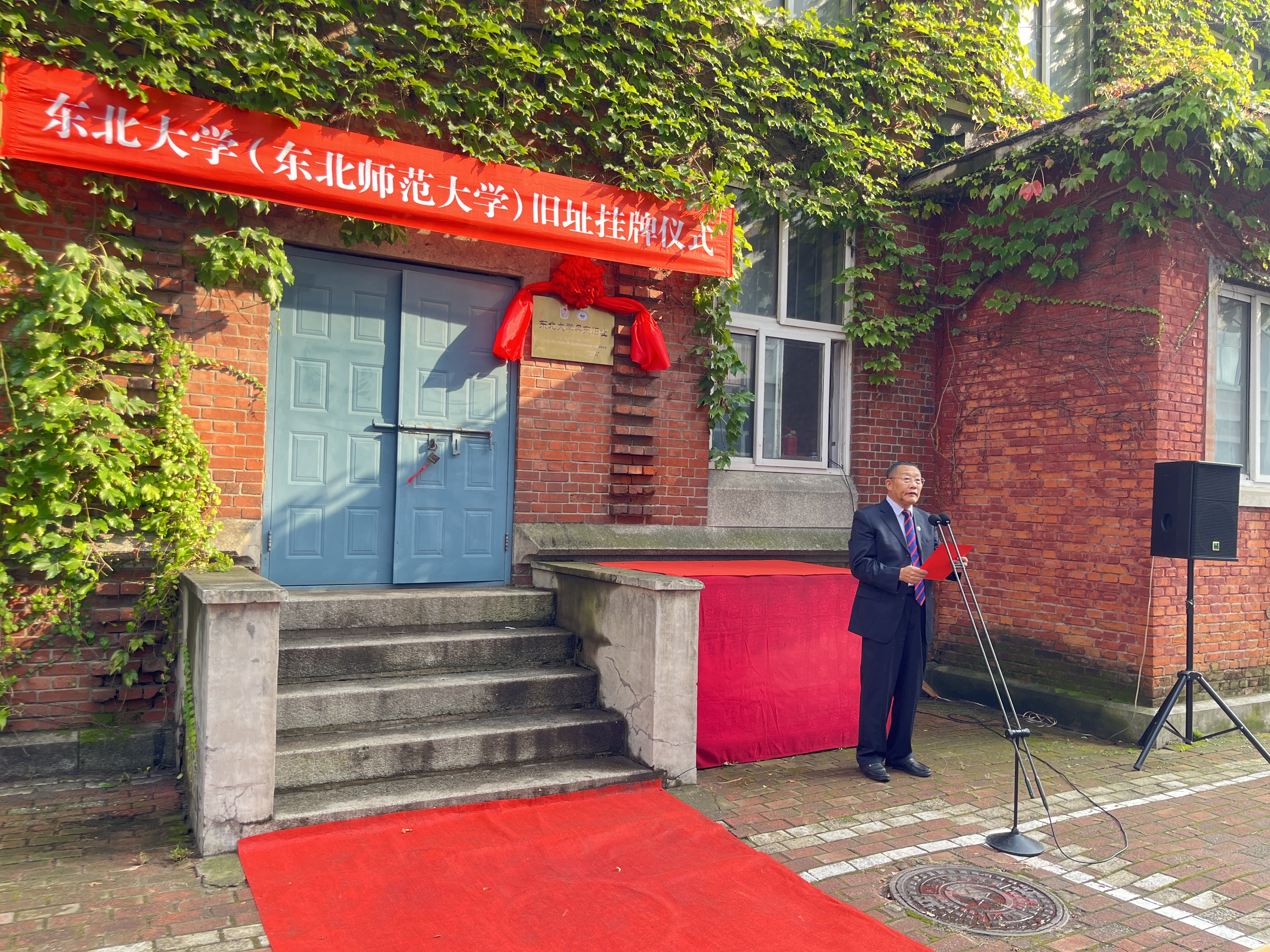 揭牌仪式上,王延、周敬思和校友代表1983级中文系校友、丹东市政协人口资源环境委员会主任李月蔷,1990级数学系校友、丹东市第一中学党委书记辛忠华共同为“东北大学丹东旧址”牌匾揭幕。周敬思回顾了学校光荣的建校史和在丹东办学期间的史实。