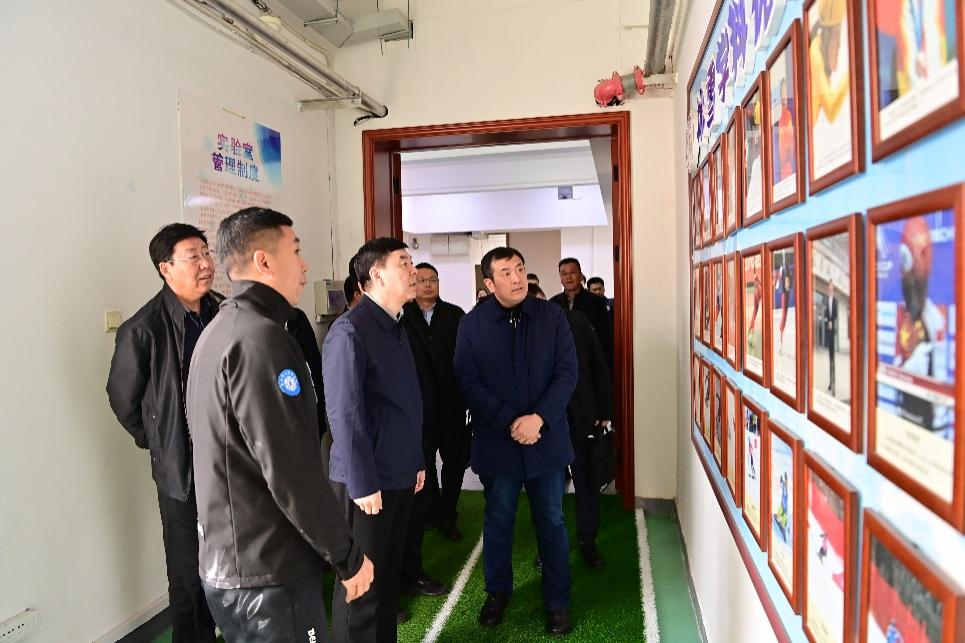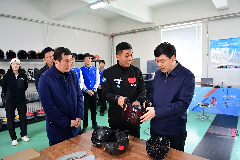在体育学院(冰雪学院),调研组详细了解我校冰雪运动人才培养情况和科技支撑冰雪运动项目方面取得的成效。吉林省冰雪运动重点实验室主任刘俊一教授对实验室的平台建设、科学化训练与科技支撑服务情况、冰雪装备研发成果进行了讲解和展示。