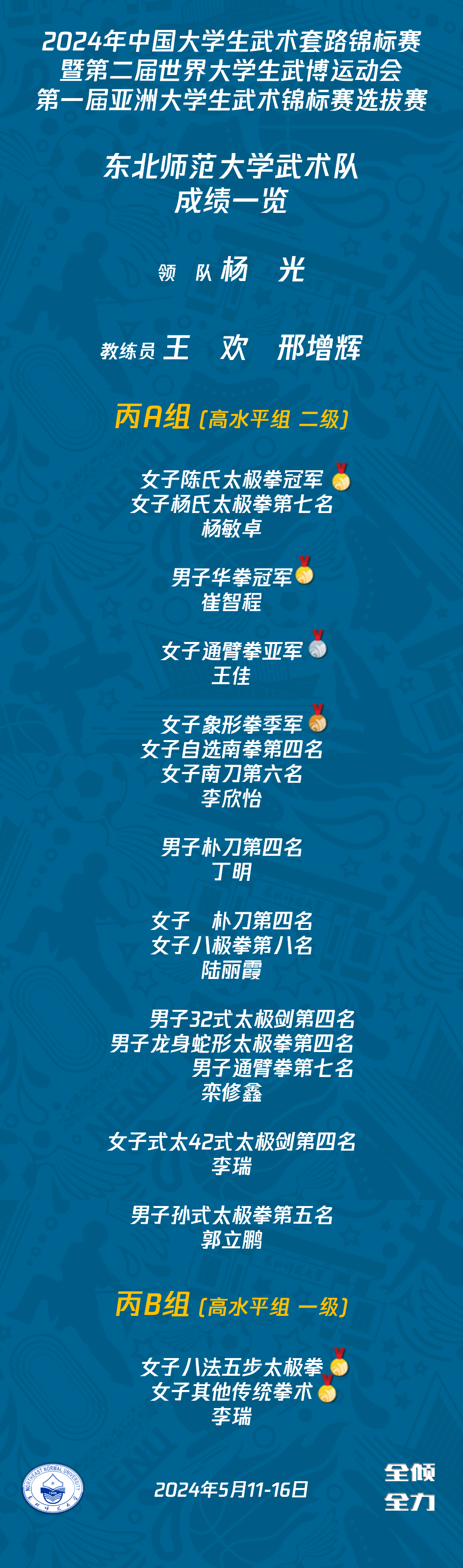 近日,由中国学生体育联合会主办的2024年中国大学生武术套路锦标赛(丙、丁组)暨第二届世界大学生武博运动会、第一届亚洲大学生武术锦标赛选拔赛在天津落下帷幕。我校体育学院武术队共夺得4金1银1铜的历史最好成绩。其中,杨敏卓夺得女子陈式太极拳冠军,李瑞夺得女子八法五步太极拳和其他传统拳术两项冠军,崔智程夺得男子华拳冠军,王佳夺得女子通背拳亚军,李欣怡夺得女子象形拳季军。