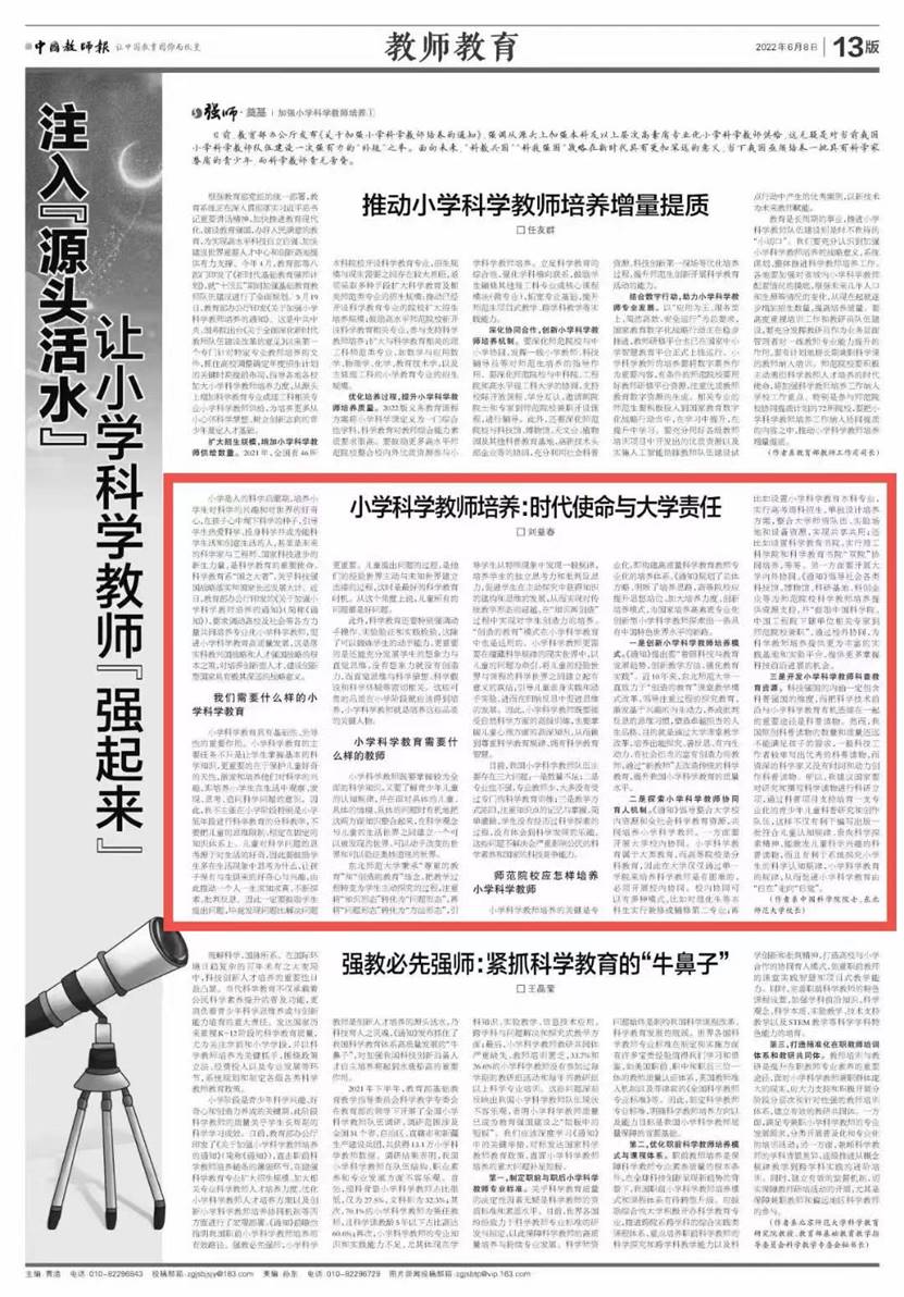 6月8日,《中国教师报》刊发了中国科学院院士、我校校长刘益春撰写的题为《小学科学教师培养:时代使命与大学责任》的文章。学习强国平台对该内容进行了转发。